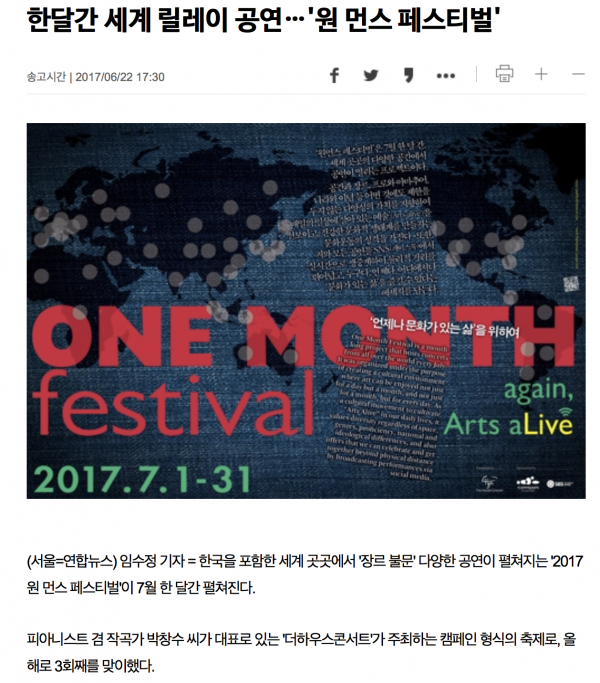 (Korean) "원 먼스 페스티벌" 연합뉴스 관련링크 본문 http://www.yonhapnews.co.kr/bulletin/2017/06/22/0200000000AKR20170622168000005.HTML?input=1179m